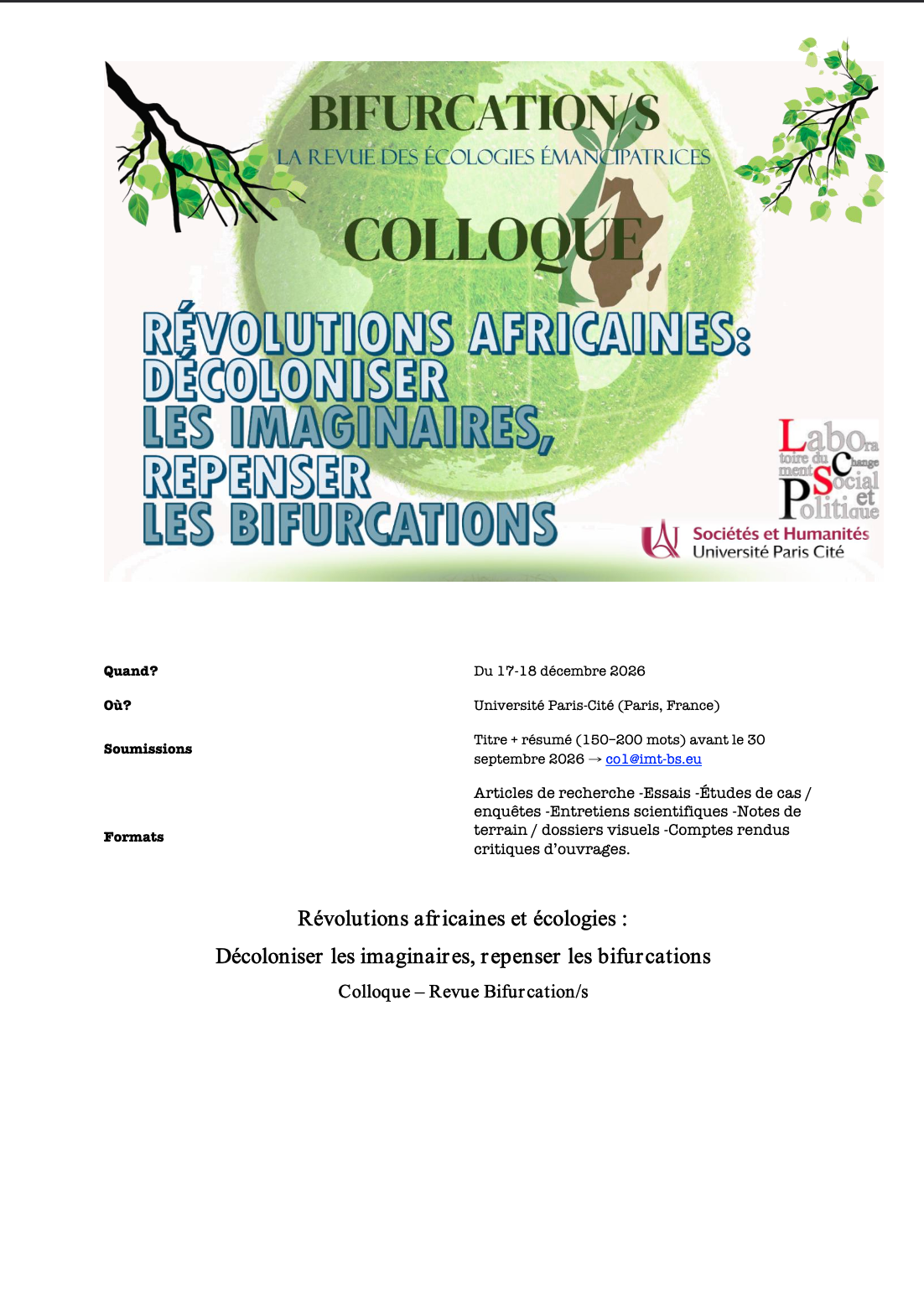 La revue Bifurcation/s – Revue des écologistes émancipatrices, en collaboration avec le Laboratoire du Changement Social et Politique et l’Université Paris Cité, lance un appel à communications pour un colloque international intitulé :