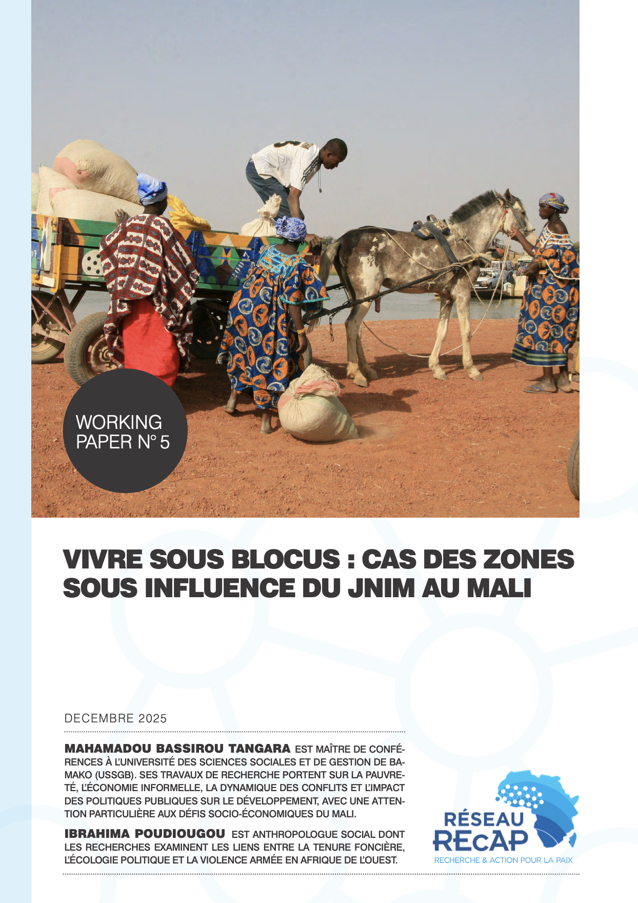 Nous avons le plaisir de vous informer que le réseau REcAP vient de publier un cinquième working paper, produit par Dr. Mahamadou Bassirou TANGARA & Dr. Ibrahima POUDIOUGOU, intitulé : “ VIVRE SOUS BLOCUS : CAS DES ZONES SOUS INFLUENCE DU JNIM AU MALI ”