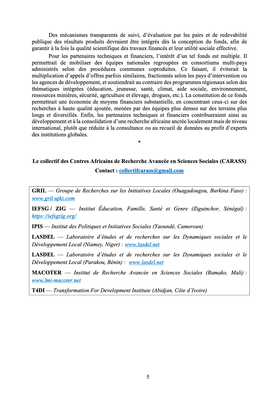 Le Manifeste de Cotonou appelle ainsi à consolider les coopérations scientifiques entre centres africains, à soutenir une autonomisation des institutions de recherche africaines et à promouvoir une production de savoirs capable d’éclairer les politiques publiques et les transformations sociales en Afrique.