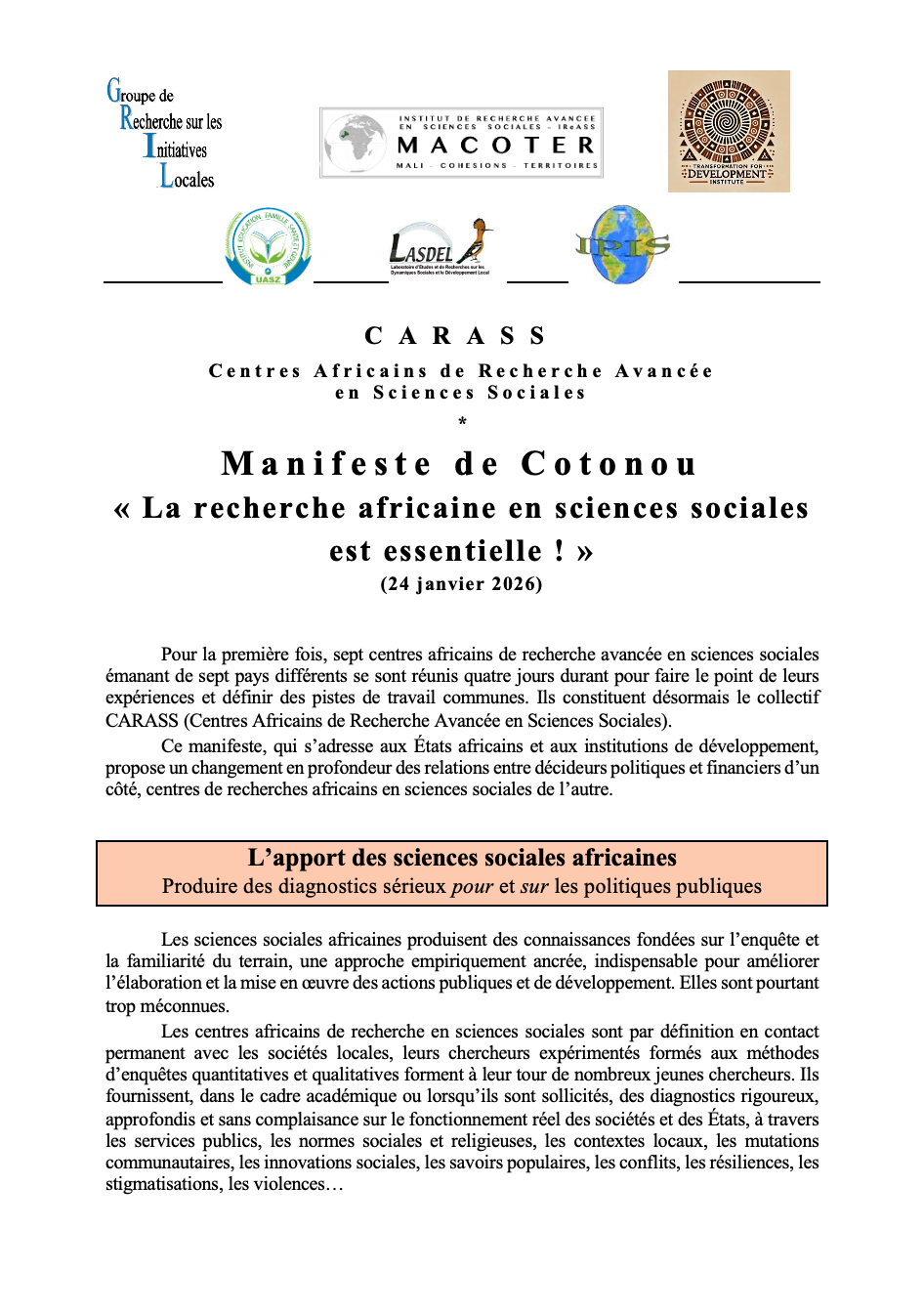 Le Manifeste ci-dessous est issu des réflexions menées lors de la rencontre des Centres Africains de Recherche Avancée en Sciences Sociales (CARASS) à Cotonou, au Bénin, du 21 au 24 janvier 2026.
